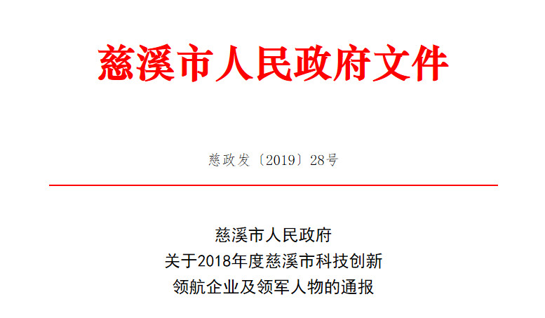 日前,慈溪市人民政府發文通報了2018年度我市科技創新領航企業及領軍人物。2018年,我市廣大科技企業認真貫徹落實市委、市政府決策部署,牢固樹立新發展理念,緊緊圍繞創新驅動發展戰略,持續推動科技創新加速賦能實體經濟能力,扎實推進創新型城市建設,有力促進了我市高質量發展。